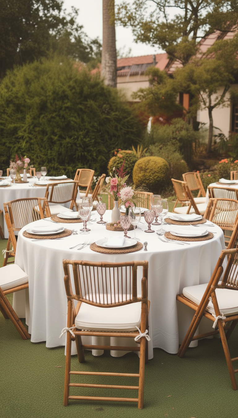 Fabricada con bambú sostenible de alta calidad, esta silla combina estilo y funcionalidad para cualquier ocasión. Su diseño plegable permite un fácil montaje y transporte. Es ideal para bodas al aire libre, fiestas en jardines o eventos corporativos.